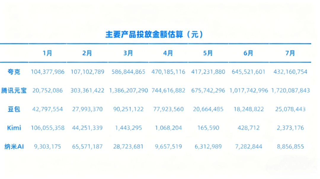 值得注意的是,在过去两年的AI产品推广中,豆包其实是相对低调的那一个,没有做大规模的市场投放。AppGrowing数据显示,2024年,国内十款大模型产品合计投放超625万条广告,投放金额达15亿元。其中投放最激进的是月之暗面的Kimi,累计投放5.4亿元,单是10月就超2亿元。2025年上半年,腾讯元宝持续发力推广。AppGrowing数据显示,自今年2月开始,元宝的投放金额一路走高,截止到7月的累计投放额近60亿元。元宝也一度登顶中国区App Store免费App下载排行榜。DataEye研究院旗下ADX行业版数据显示:11月大陆市场原生AI产品投放素材89.1万组。其中,腾讯元宝素材量占比46%、千问占比34%、豆包仅11%,也就是说,在买量层面,豆包的投入强度,大约只有元宝和千问的三分之一。