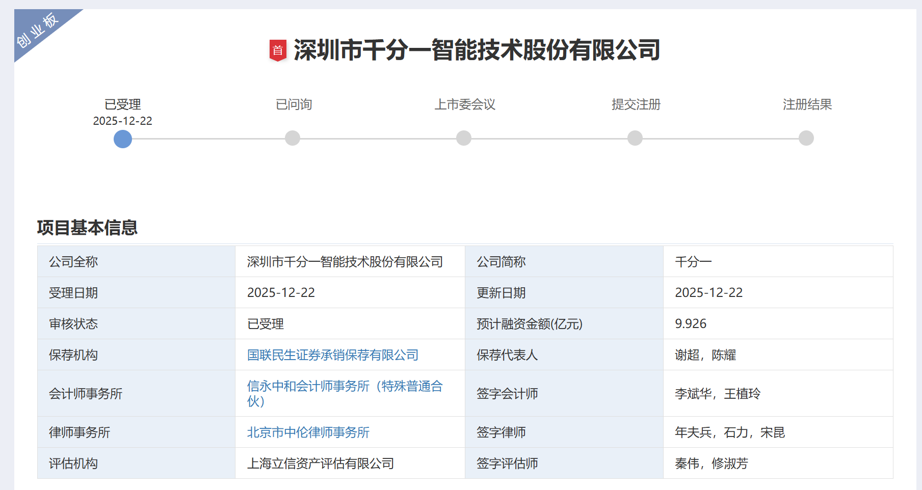 千分一创业板IPO获深交所受理。