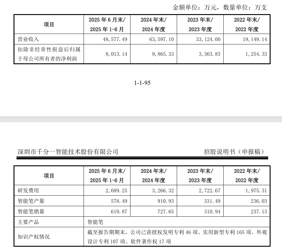 招股说明书显示,2022年至2024年以及2025年上半年,千分一的智能笔销量分别为237.13万支、310.94万支、727.65万支、619.87万支。