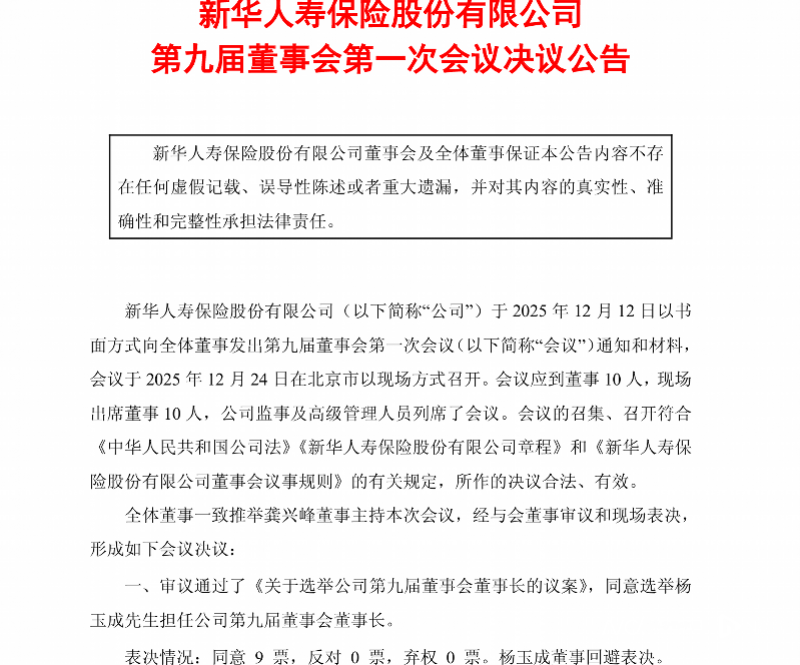12月24日,新华保险完成董事会换届。据新华保险公告披露,当日该公司第九届董事会第一次会议在北京以现场形式召开,经与会董事审议及现场投票,选举杨玉成担任新华保险第九届董事会董事长。