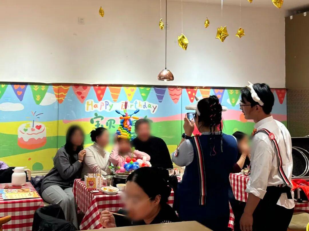 甚至还有不少桌都是家长带着孩子来的,有一桌孩子正好在过生日,西贝的魔术师在认真的表演魔术,一桌人都开心的看着。
