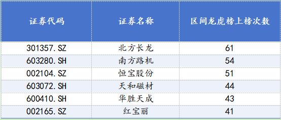 今年以来,登榜超过40次的个股还有南方路机、恒宝股份、天和磁材、华胜天成、红宝丽,分别登榜54次、51次、44次、43次、41次。