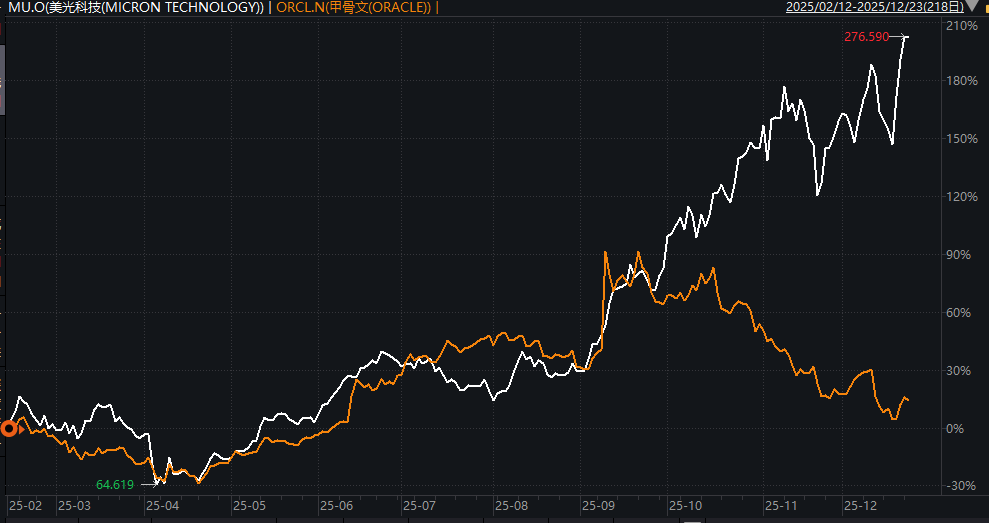 图:美光和甲骨文股价走势分化
