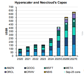 其次,为了支撑这场竞赛,巨头的资本开支(CapEX)加速扩张。在2025年第三季度财报后,市场进一步调高了美国四大云商(亚马逊、Meta、微软、谷歌)的资本开支预测。根据伯恩斯坦数据,预计2024—2027年的CAGR将达33%,总额达到约5360亿美元。如果加上新兴云服务商(Neo-cloud)和甲骨文,整体资本开支到2027年将达到6300亿美元,较此前共识上调近20%。而根据各大厂财报,资本开支中的80%以上流向了“AI基础设施”。