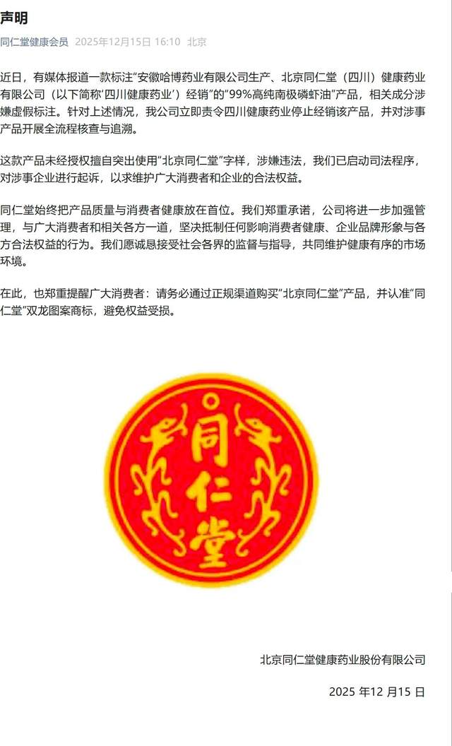 这款“问题产品”,到底是不是同仁堂的“亲儿子”?其实一开始各方面颇有猜测但,事件发酵后,北京同仁堂健康药业股份有限公司迅速发布声明,明确指出涉事产品未经授权,擅自突出使用“北京同仁堂”字样,涉嫌商标侵权与不正当竞争。