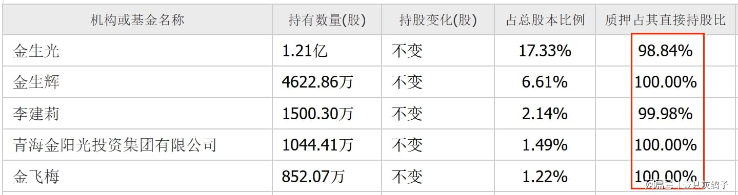 金生光是哥哥,金生辉是弟弟,金飞梅是妹妹,李建莉是金生光的配偶,青海金阳光投资是金生光兄弟俩的公司,一家人的股权都全质押了。