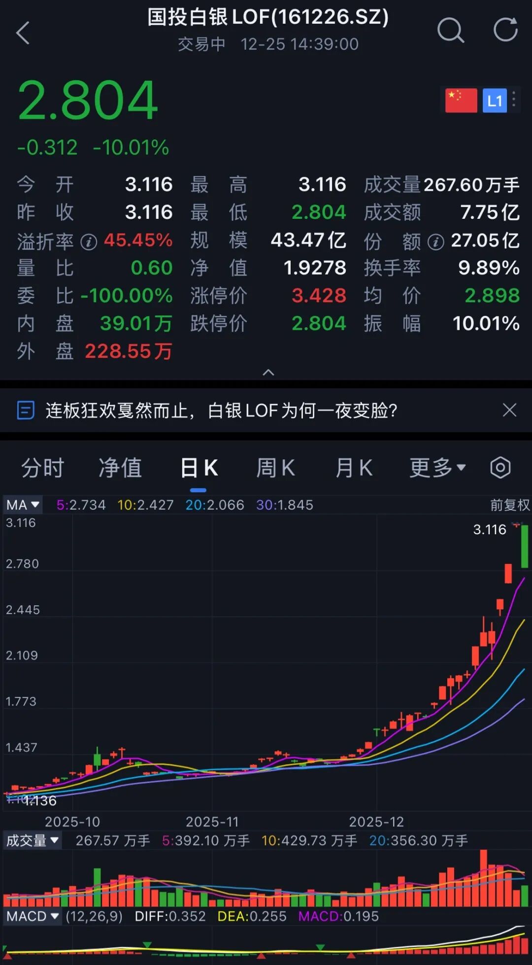或是大量套利资金来袭,这场狂欢在12月25日突然“熄火”,国投白银LOF当日复牌跌停,封单金额超10亿元,溢价幅度收窄至45%。