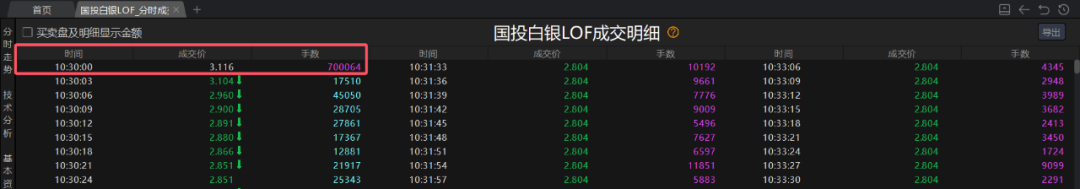 10点半国投白银LOF(161226)复牌,复牌的时候进行了一次集合竞价撮合,以确定复牌后的首个成交价格,之后再进入连续竞价阶段。