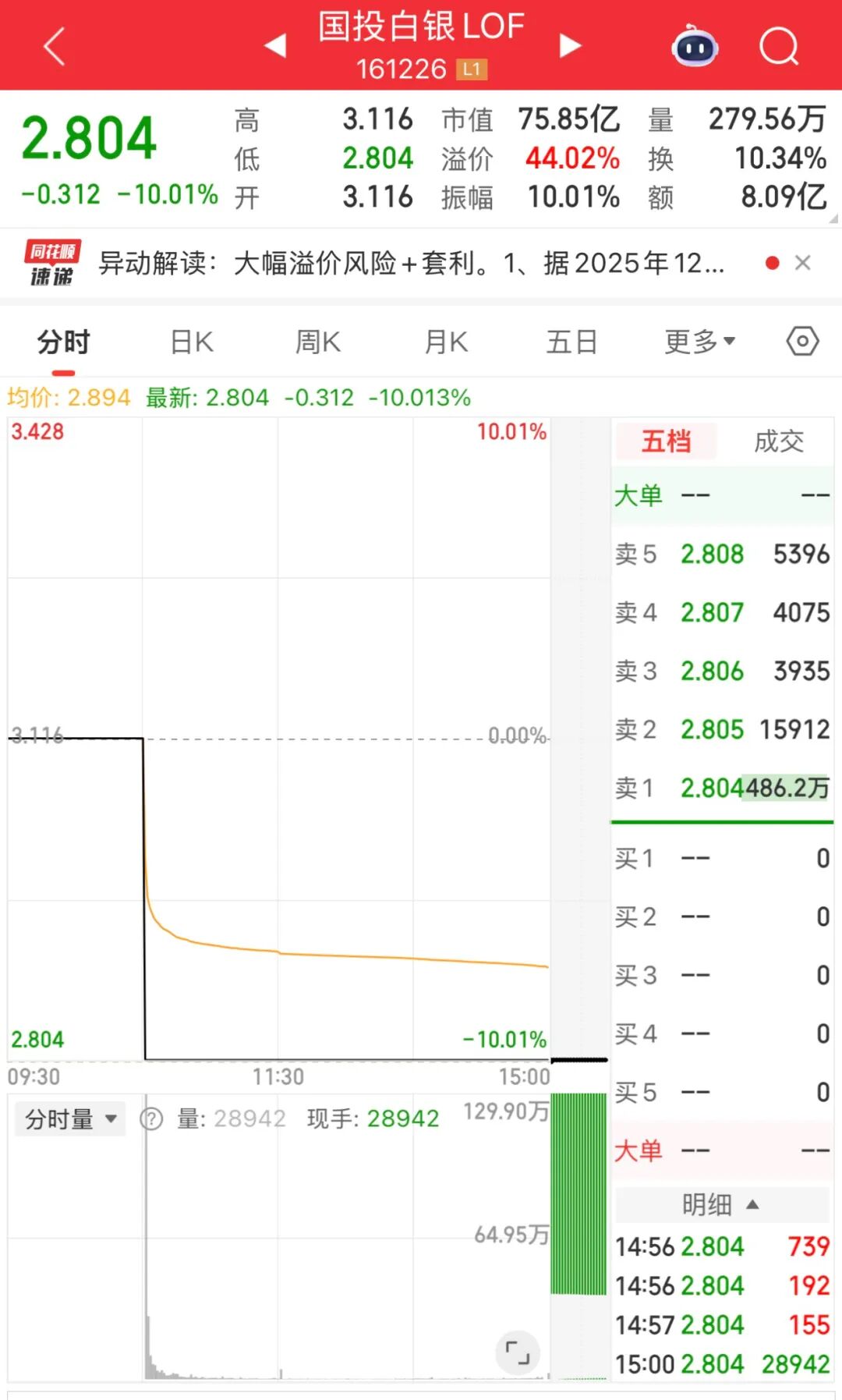 如果你今天还想着等别人博傻进来接盘,按照涨停价进行委托,大概率成交不了,等你进行第二次改单的时候,国投白银LOF(161226)已经跌停了。