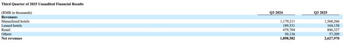 截至2025年第三季度,亚朵酒店网络在运营酒店数量达1948家,客房总数达219359间,酒店数量和客房数量同比分别快速增长27.1%和25.2%,其中,加盟酒店数量达到1924家,还有754家管理加盟酒店正在开发中。