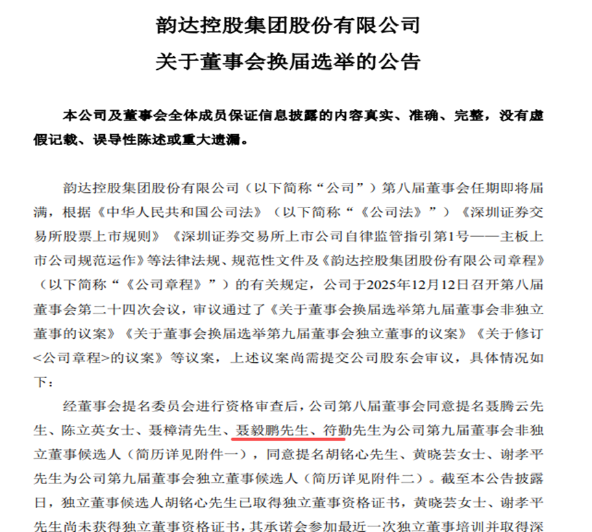12月13日,韵达股份发布董事会换届选举公告,提名聂腾云、陈立英、聂樟清、聂毅鹏、符勤为第九届董事会非独立董事候选人,胡铭心、黄晓芸、谢孝平为独立董事候选人。在这份名单中,出生于2001年、年仅24岁的聂毅鹏尤为引人关注,其身份为实际控制人聂腾云与陈立英之子。
