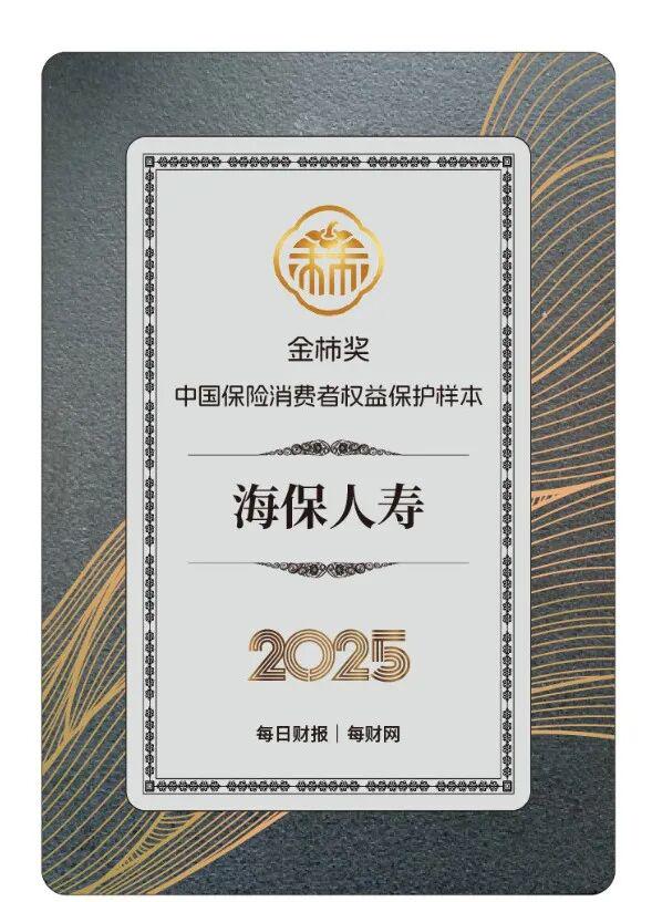 做好金融消费者权益保护工作,是践行金融工作政治性、人民性的集中体现,更是推动金融业高质量发展的必然要求。近日,凭借在消费者权益保护领域的扎实举措与突出成效,海保人寿获评“2025 金柿奖·中国保险消费者权益保护样本”,这一奖项是行业与市场对公司践行“金融为民” 理念的高度认可。