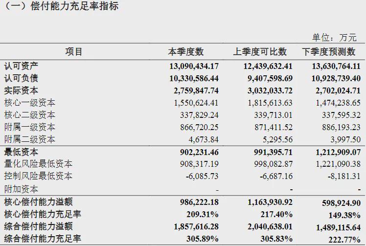 以中英人寿来看,据其披露的今年前三季度偿付能力报告显示,截至今年该期末,其核心偿付能力充足率209.31%,较上季度末有所下滑,而下季度预测数只有149.38%,综合偿付能力充足率305.89%,较上季度末略增,但下个季度预测数只有222.77%。