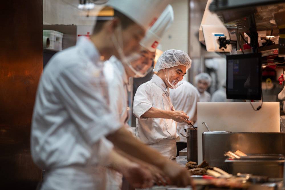 店里的厨师长辗转各个菜品档口,给各类菜品做着预加工;年轻的女服务员在给彼此扎着头发,并把彩色的辫绳编在辫子里;变魔术的小哥身着表演服举着一朵玫瑰,走上前问,需要不需要表演。