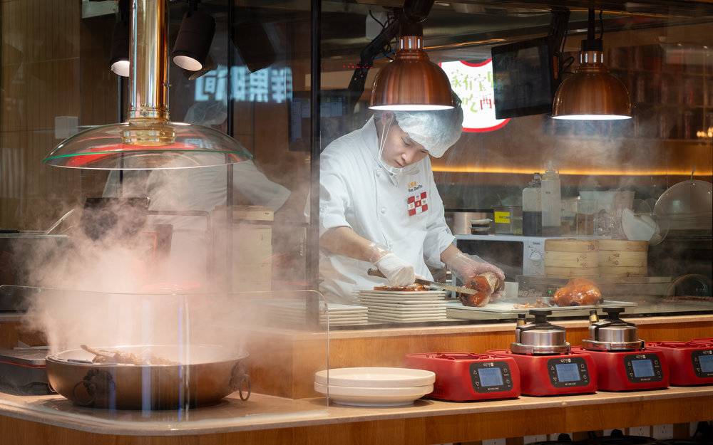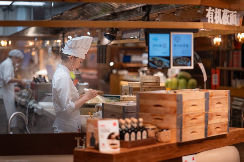 他在北京财富购物中心盘下了278平米的一家店,打造了一个“厨房里的餐厅”,所有的后厨场景如搓莜面、拌面筋、乃至炒菜都被挪到了台前,变成全明档。