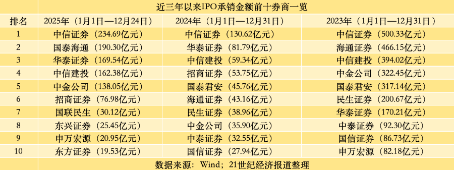 另一家值得特别留意的券商是华泰证券,其2025年承销金额已逼近2023年水平。2023年,华泰证券IPO承销金额为170.21亿元,位列行业第七;而2025年1月1日至12月24日,其IPO承销金额已达169.54亿元,位居行业第三。而其他近三年来IPO承销金额均位列券业前十的头部券商,2025年IPO承销金额均与2023年存在较大差距。