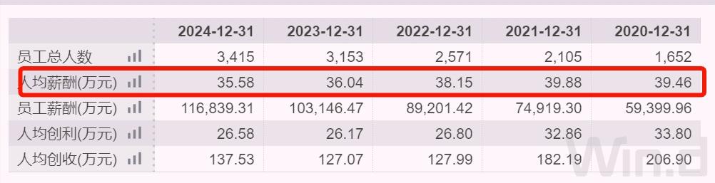 至于职工整体薪酬情况,根据万得大数据,至2024年末,公司职工总数超过3400人,去年人均创利26.6万元,人均税前薪酬35.6万元,比2023年略有减少。