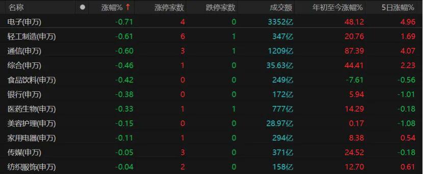 电子、轻工制造、通信、综合、食品饮料、银行等板块表现相对弱势。