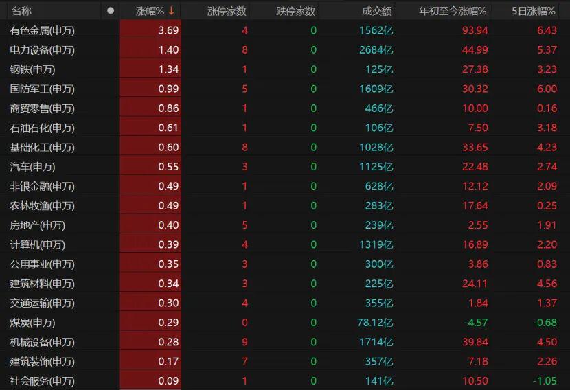 31个申万一级行业中,19个板块收红,有色金属大涨3.69%,永兴材料、国城矿业、江西铜业、深圳新星涨停;电力设备、钢铁、国防军工、商贸零售等板块表现也不错。