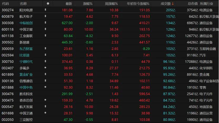 个股跌多涨少,3414只个股收跌,跌停股3只;1866只个股收涨,涨停股92只。8只个股日成交额超过100亿元,阳光电源收涨7.86%报181.08元/股,航天电子收涨4.62%报19.47元/股,中国卫星涨停。