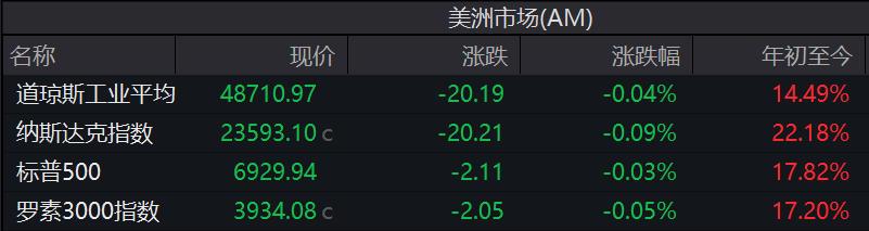 截至收盘,道指跌0.04%,报48710.97点;标普500指数跌0.03%,报6929.94点;纳指跌0.09%,报23593.10点。