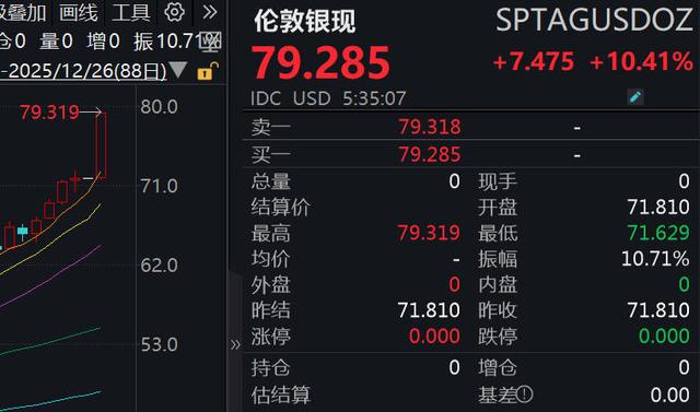 贵金属表现强势,现货白银持续拉升,突破79美元/盎司续创新高,涨幅超10%。伦敦金现、COMEX黄金均涨逾1%。现货钯金涨幅扩大至15%。