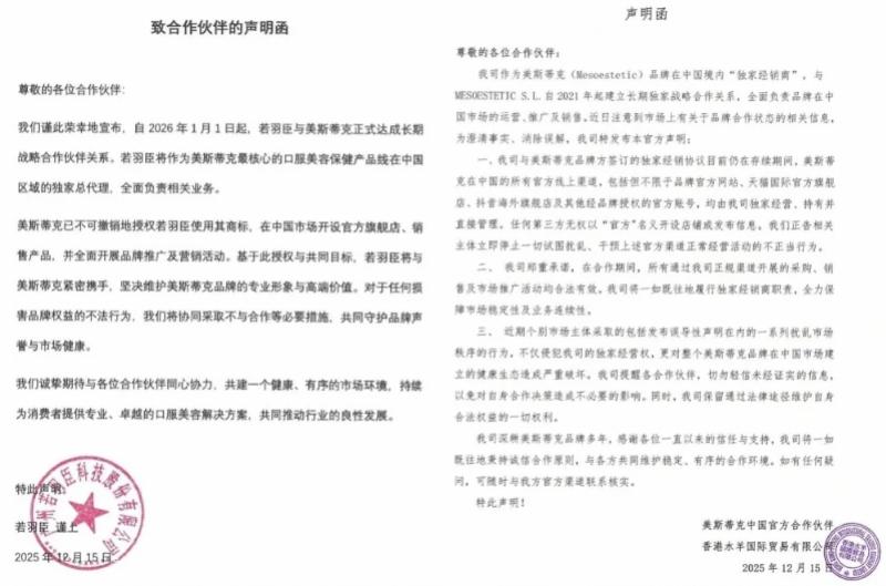 与此同时,另一家美妆上市公司水羊股份(300740.SZ)通过旗下子公司香港水羊国际贸易有限公司发布声明称,公司自2021年起代理美斯蒂克中国业务,仍为该品牌在中国境内的“独家经销商”,并强调任何第三方均无权以“官方”名义开设店铺或对外发布相关信息。