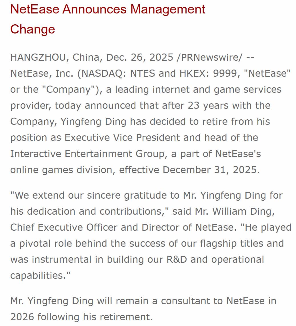 北京时间12月27日凌晨(美股交易日期间),网易集团发布公告,宣布网易集团执行副总裁、互动娱乐事业部负责人丁迎峰(丁丁)将于2025年12月31日正式退休。后续他将继续担任公司顾问一职。