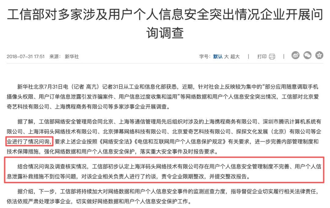 一见财经查询新闻报道发现,2018年7月31日,工信部的确针对“部分应用随意调取手机摄像头权限、用户订单信息泄露引发诈骗案件、用户信息过度收集和滥用”等网络数据和用户个人信息安全突出情况,展开了调查,当时对携程“进行了情况问询”。