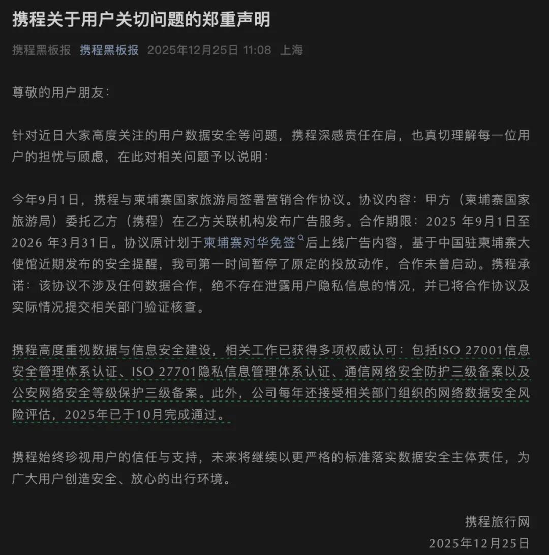 携程在声明中称,今年9月1日,携程与柬埔寨国家旅游局签署营销合作协议,委托携程在其关联机构发布广告服务,合作期限为2025年9月1日至2026年3月31日。