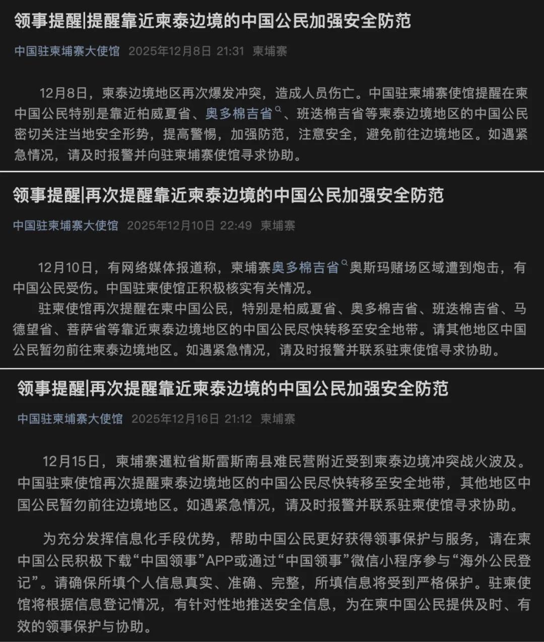 一见财经注意到,中国驻柬埔寨大使馆分别于12月8日、12月10日和12月16日发文,提醒中国公民加强安全防范。