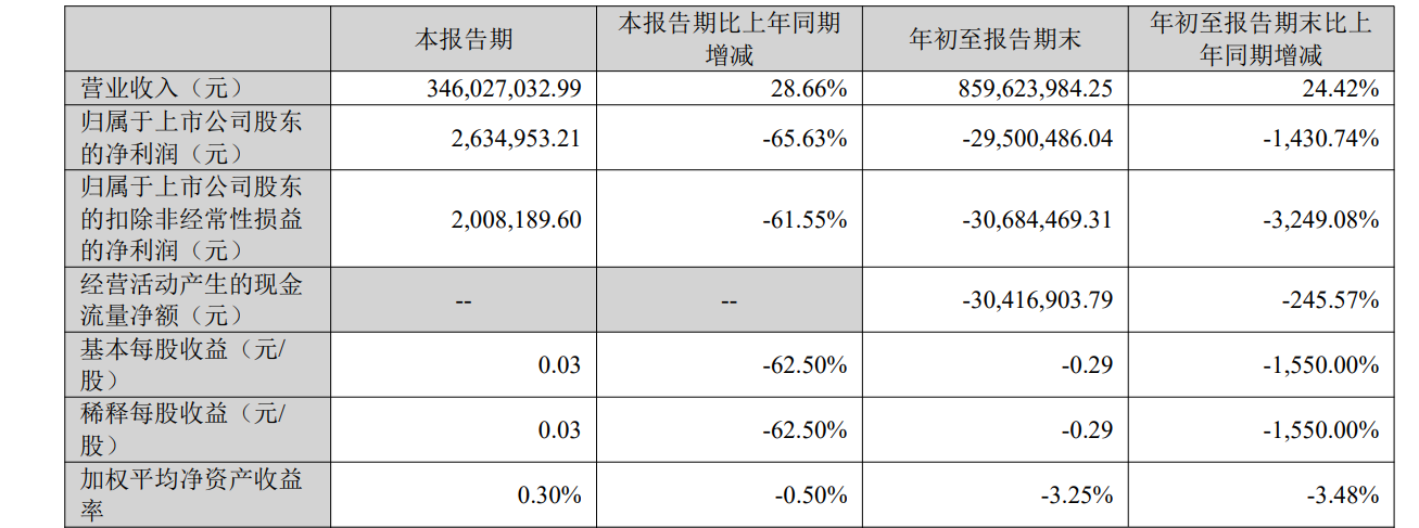 今年前三季度,该公司实现营业收入8.6亿元,同比增长24.42%;归母净利润亏损2950.05万元,同比骤降1430.74%。