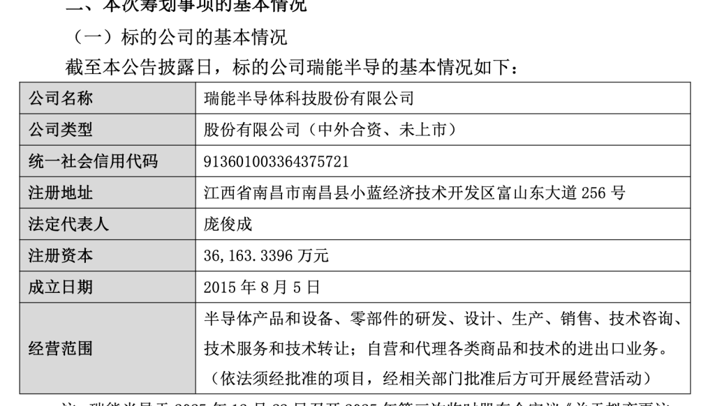 瑞能半导为中外合资企业,公司成立于2015年8月5日,注册地址位于江西省南昌市,经营范围包括:半导体产品和设备、零部件的研发、设计、生产、销售、技术咨询、技术服务和技术转让;自营和代理各类商品和技术的进出口业务。