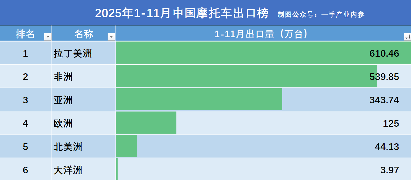 拉丁美洲依然保持着,中国摩托车第一进口市场的地位。2025年1-11月,拉美地区进口了610.46万辆的中国摩托车,同比增速为12.19%;其进口金额为37.26亿美元,同比增速为20.33%。