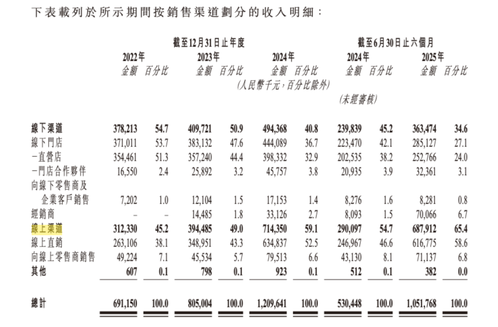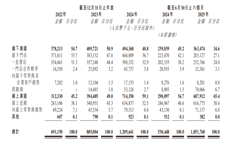 在线渠道方面,林清轩的在线渠道主要由在线直销及向在线零售商销售组成。2022年、2023年及2024年在线渠道收入分别为3.12亿元、3.94亿元及7.14亿元,分别占总收入的45.2%、49.0%及59.1%,在线渠道收入占总收入的比重呈持续上升趋势。截至2025年6月30日止六个月在线渠道收入为2.90亿元和6.88亿元,同比增长137.24%。