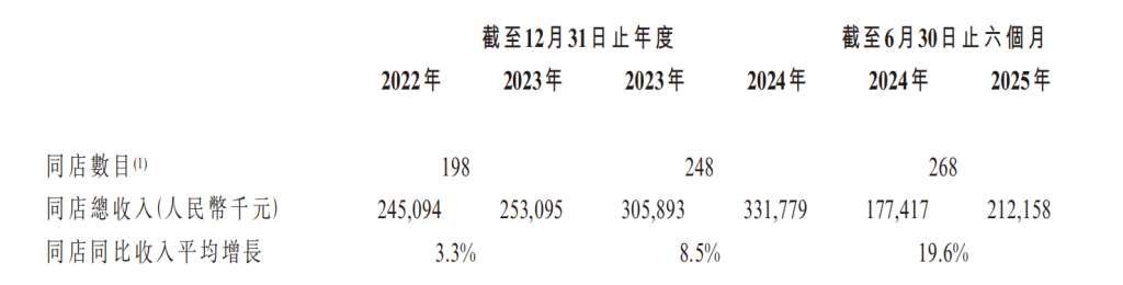 其中,2022年至2023年、2023年至2024年、截至2024年及2025年6月30日止六个月直营店的同店同比收入平均增长分别为3.3%、8.5%及19.6%。主要得益于新SKU的推出推动产品销量增长、现有核心大单品的升级及透过精细化管理所实现的营运效率提升。