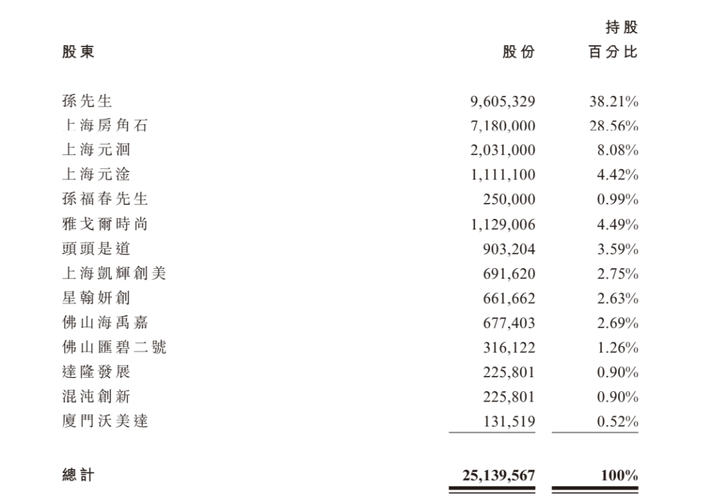 股权结构方面,招股书显示,IPO前,截至最后可行日期,孙来春直接持股38.21%,并透过上海房角石(28.56%)、上海元洄(8.08%)及上海元淦(4.42%)间接持股,共计持股79.27%,为公司实际控制人。其兄孙福春持股0.99%,雅戈尔时尚持股4.49%,为最大外部股东。头头是道基金持股3.59%,上海凯辉创美持股2.75%,此外,星翰妍创、佛山海禹嘉等资本共持股8.9%。