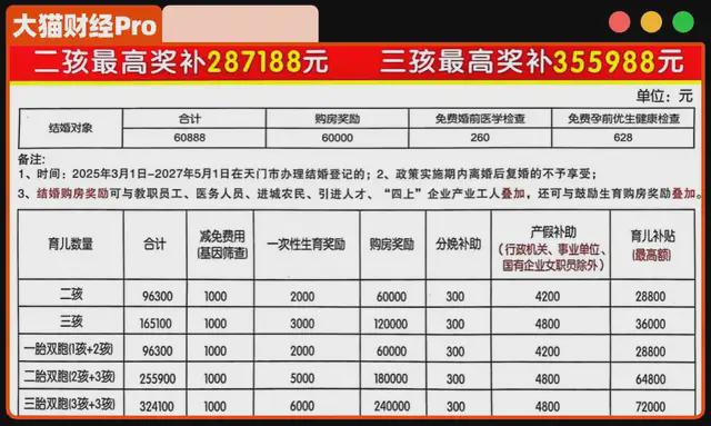 除了送房子,还送钱,三孩家庭有一次性1万元奖励和每月500元的育儿补贴到三周岁,算下来一共2.8万,比国家基础版补贴,高了1.8万。