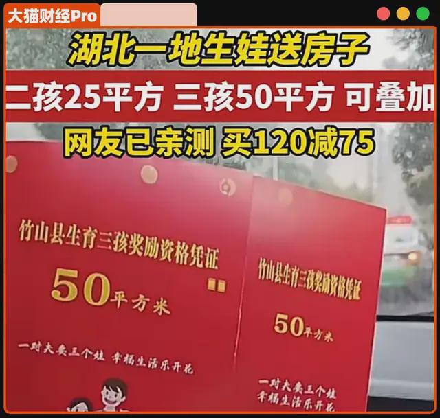 他所在的竹山县的新房均价在4500元左右,总的算下来,二孩补贴11万左右,三孩累计补贴30万左右。
