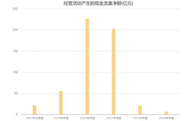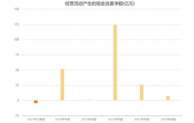 上图是赣锋锂业的近几年经营现金流净额,波动就更大了,前年的柱子已经快看不见了,去年也还行,有52亿,今年前三季度就已经是负4个亿了。