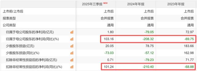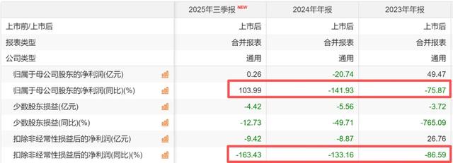 上图是赣锋锂业的,我也用红色框出来了,之前也正常,但是今年三季报的归母净利润0.26亿,同比增长了104%,而扣非净利润亏损9.42亿,同比继续大降163%。