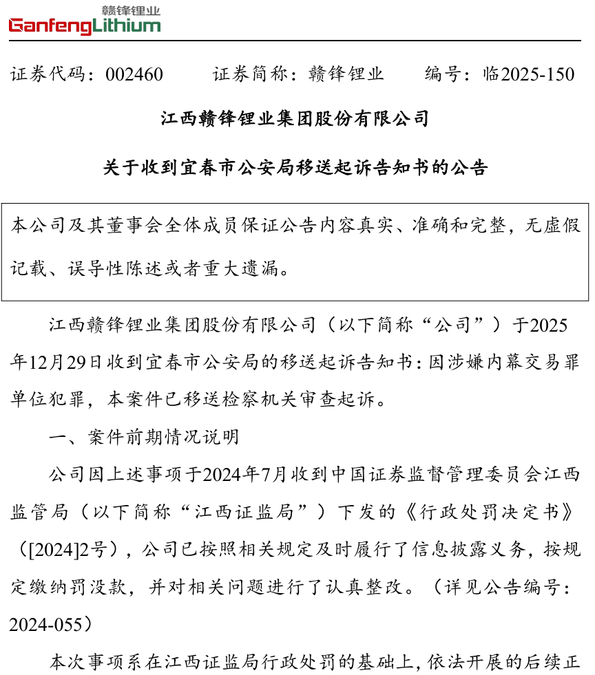 昨日晚间,赣锋锂业公告称,公司于当日收到宜春市公安局的移送起诉告知书。
