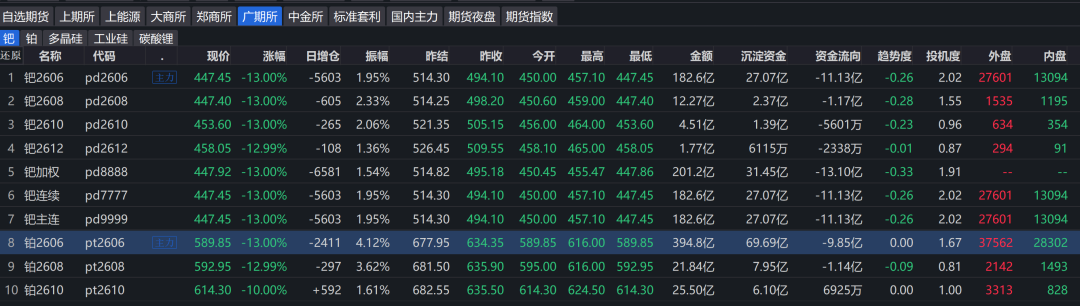 2025年12月30日,广期所的铂、钯主力合约同步跌停,跌幅高达13%,领跌国内期货市场,成为当日跌幅最大的两个品种,凸显出贵金属市场短期情绪承压明显。国际市场上,隔夜伦敦铂金大跌13.71%,伦敦钯金下跌15.76%。