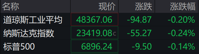 当地时间周二,美股三大指数集体收跌,截至收盘,标普500指数跌0.14%,纳指跌0.24%,道指跌0.20%。