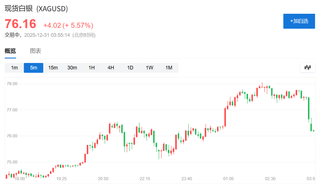 30日,现货白银涨近5.6%至76.16美元/盎司。此前一个交易日曾暴跌9%。这轮抛售发生在投机性交易和供应短缺担忧推动白银价格创历史性飙升之后。
