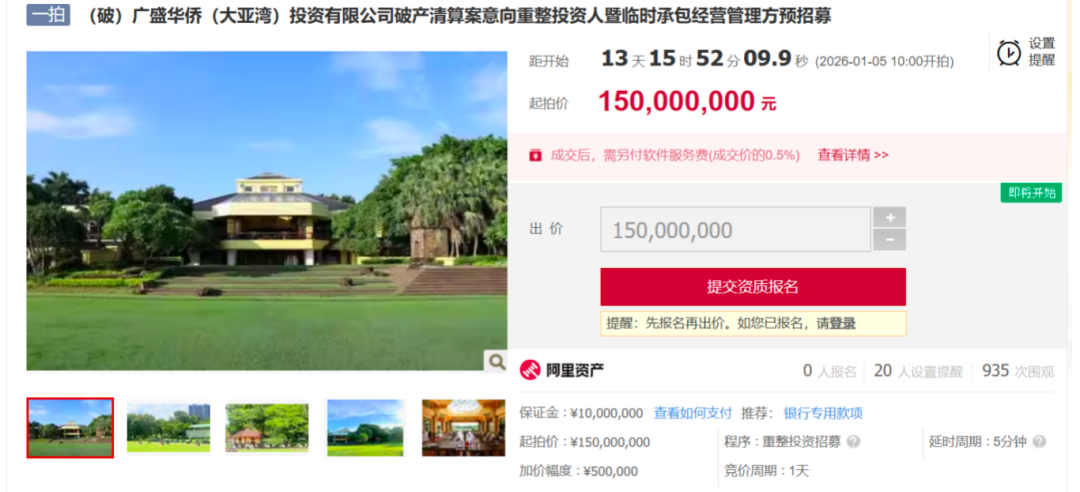 据阿里资产平台公告,惠阳棕榈岛高尔夫球场及相关资产将于2026年1月5日迎来拍卖,起拍价1.5亿元。