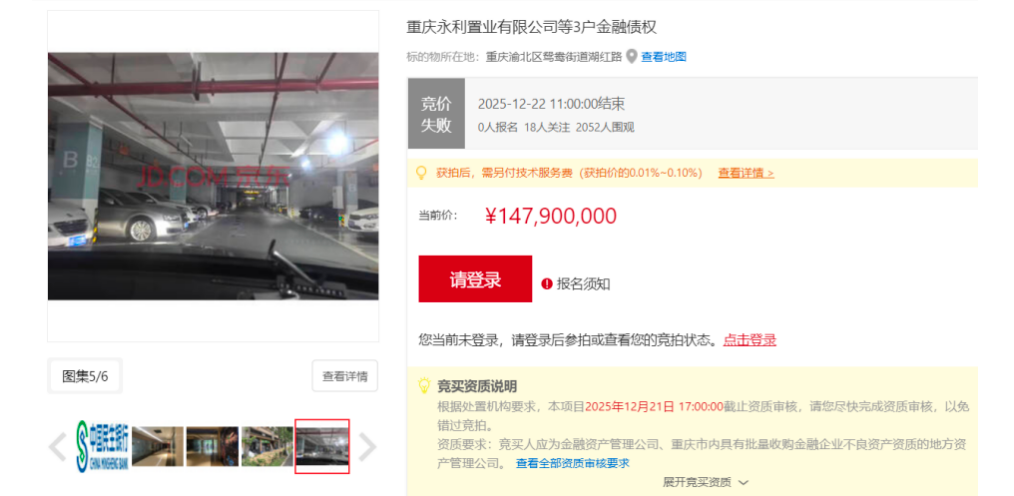 民生银行重庆分行也在推进恒大系债权处置。12月22日,民生银行在京东拍卖平台挂牌转让重庆永利置业等三户债权,本息合计9.92亿元,起拍价1.48亿元,折扣约1.5折。