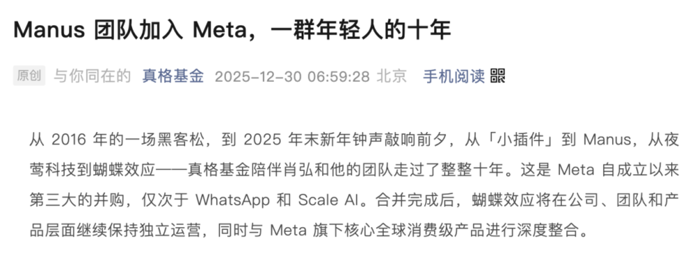 和其他国内外铺天盖地的媒体都在报道“Meta收购Manus”或者“Manus卖身Meta”不同,这几方当事人的用词显得十分克制,甚至在有意淡化和回避这个问题。