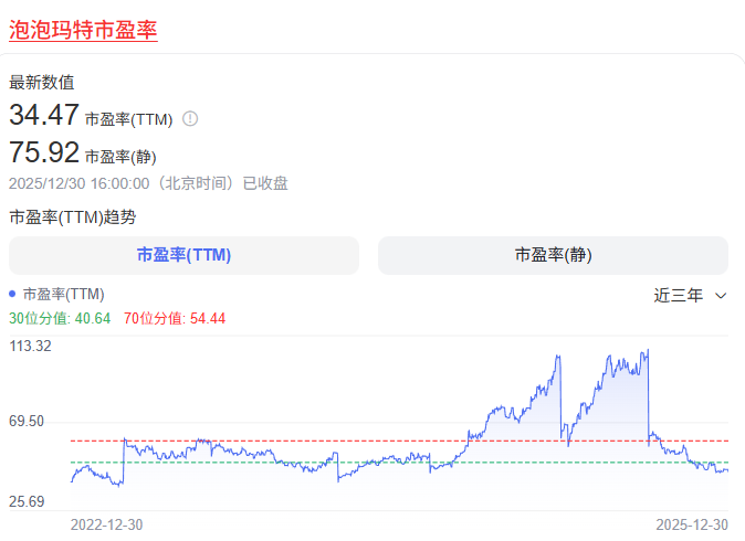 就算是现在,泡泡玛特的市盈(TTM)依旧还有34.47倍。