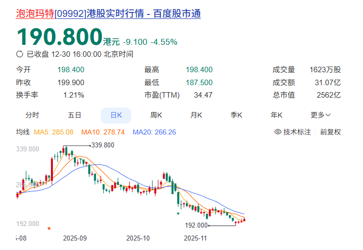 截至2025年12月30日收盘,泡泡玛特的股价为190.8港元/股,相比几个月前的历史高点已经跌去43%,几近腰斩。